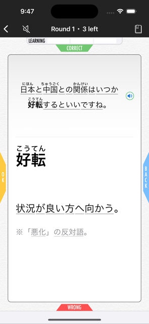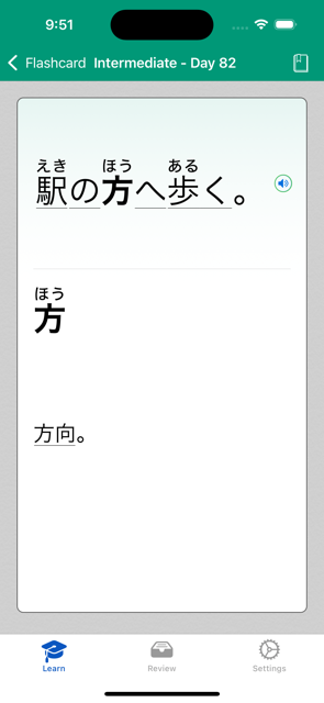 As you might notice in the screenshots, I'm adopting Nihongo's strategy for the "learn" phase of a card. This means you'll be presented with new words in groups of 10, and need to mark each one correct 3 times before they move into the "review" pile. I believe this repetition gives you a more solid foundation than simply viewing the card once and tapping learn.